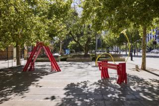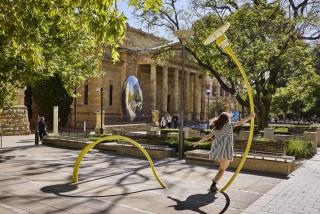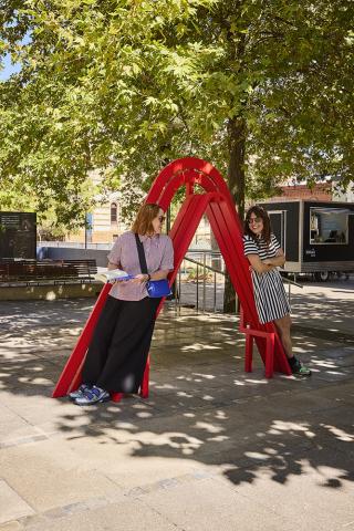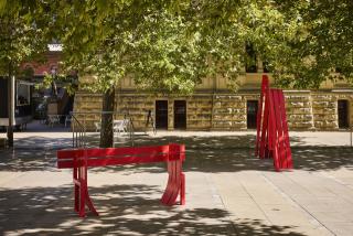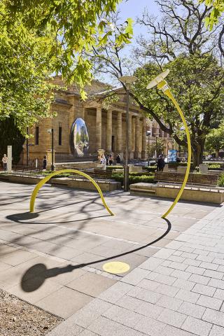 A trio of Jeppe Hein’s modified social sculptures have been brought to the tree-covered forecourt on the North Terrace Boulevard. The artist’s exploration of urban architecture and social behaviour in public spaces led to his series of bench and lamp designs. His two bright red benches and yellow lamp borrow their basic form from the ubiquitous park bench or streetlight but are tweaked, twisted or modified, making the act of using them a conscious interaction. With their adaptations, the benches and light in turn transform their surroundings into places of activity and engagement. The sculptures shift between functional city furniture and interactive works of art.
